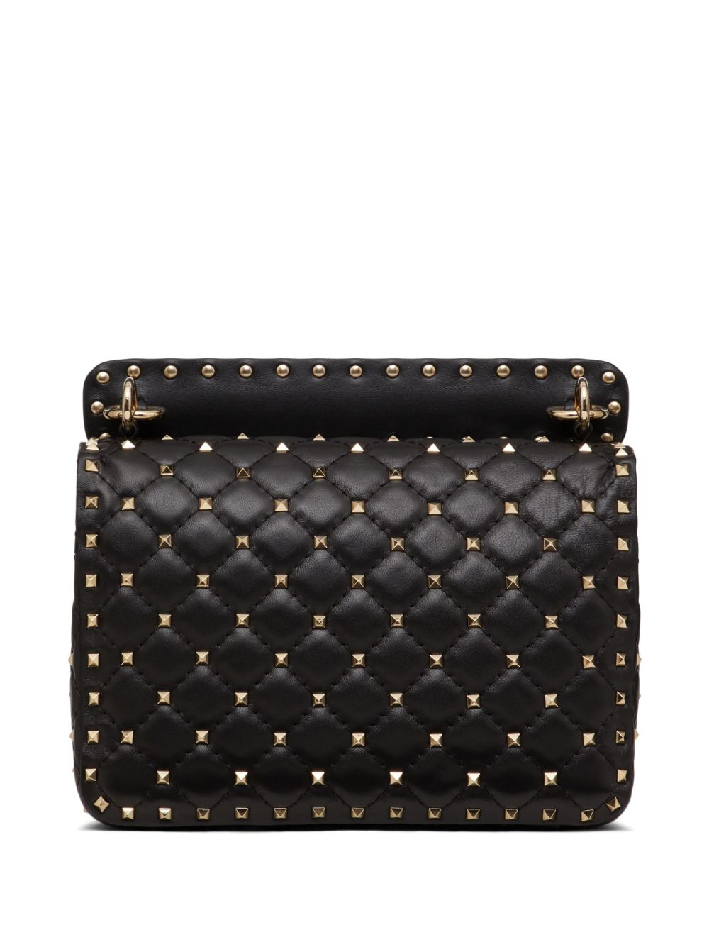 Nero, cuoio, dettagli Rockstud color oro, manico singolo, tracolla a catena, pattina nella parte superiore, chiusura a girello e tasca interna applicata.