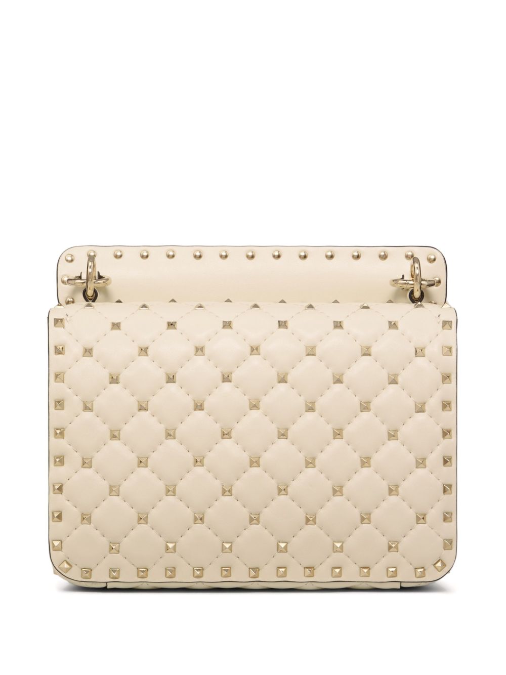 Bianca cuoio, dettagli Rockstud color oro, manico singolo, tracolla a catena, pattina nella parte superiore, chiusura a girello e tasca interna applicata.
