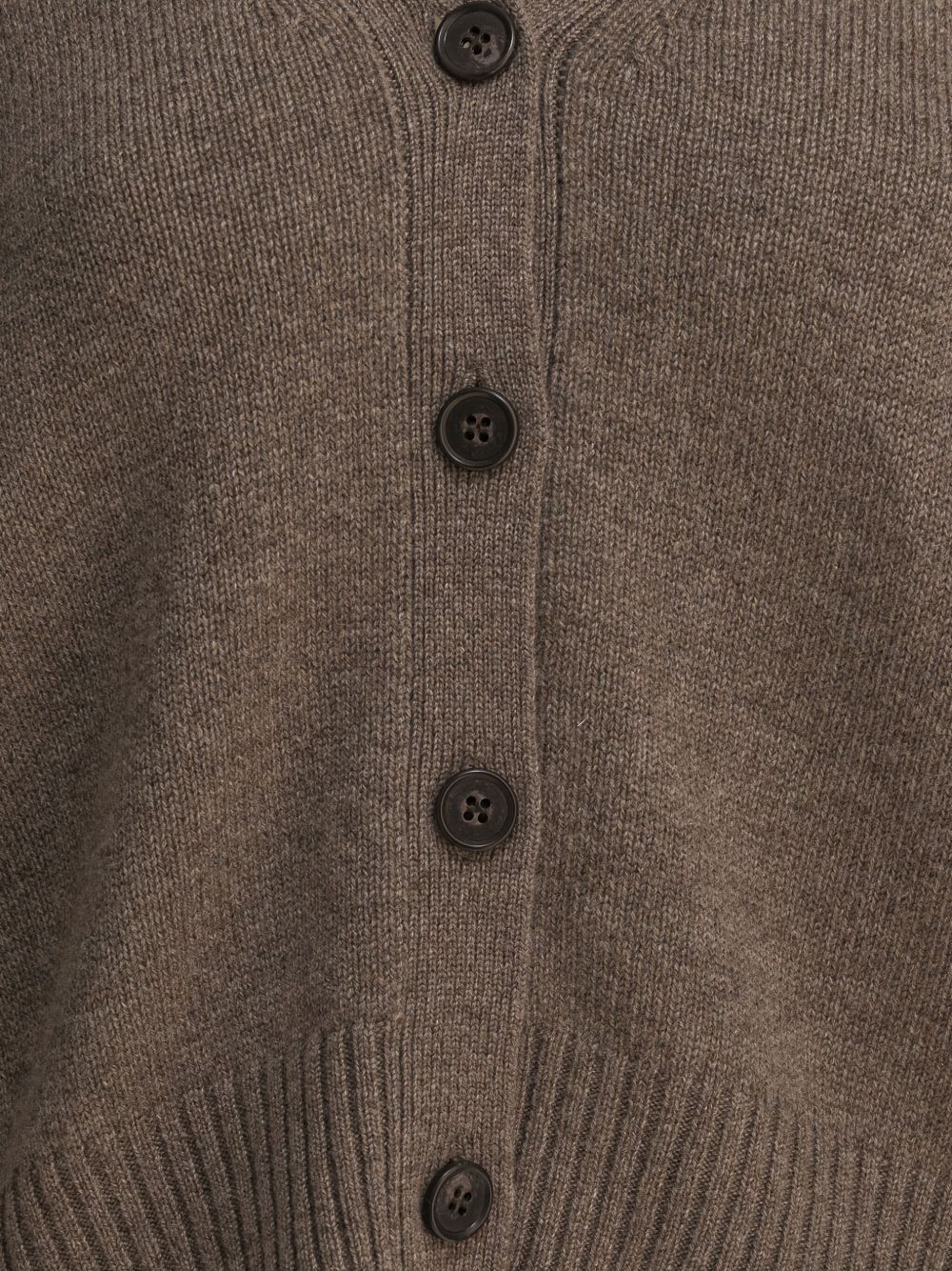 Maglione in cashmere marrone con scollo a V, chiusura frontale con bottoni, maniche lunghe e orlo a coste | Lisa Yang