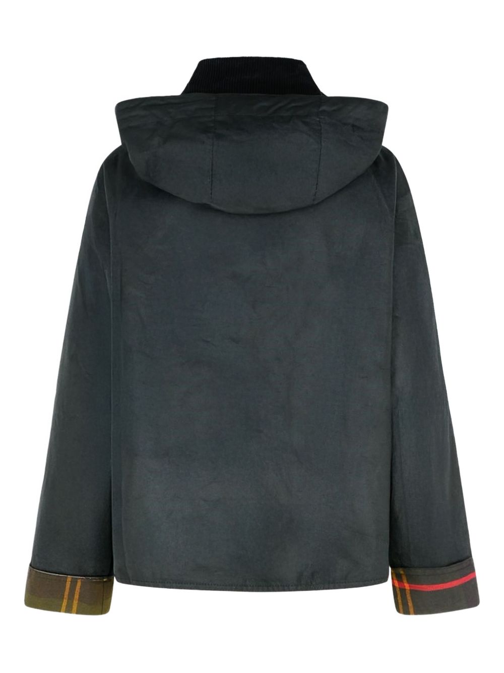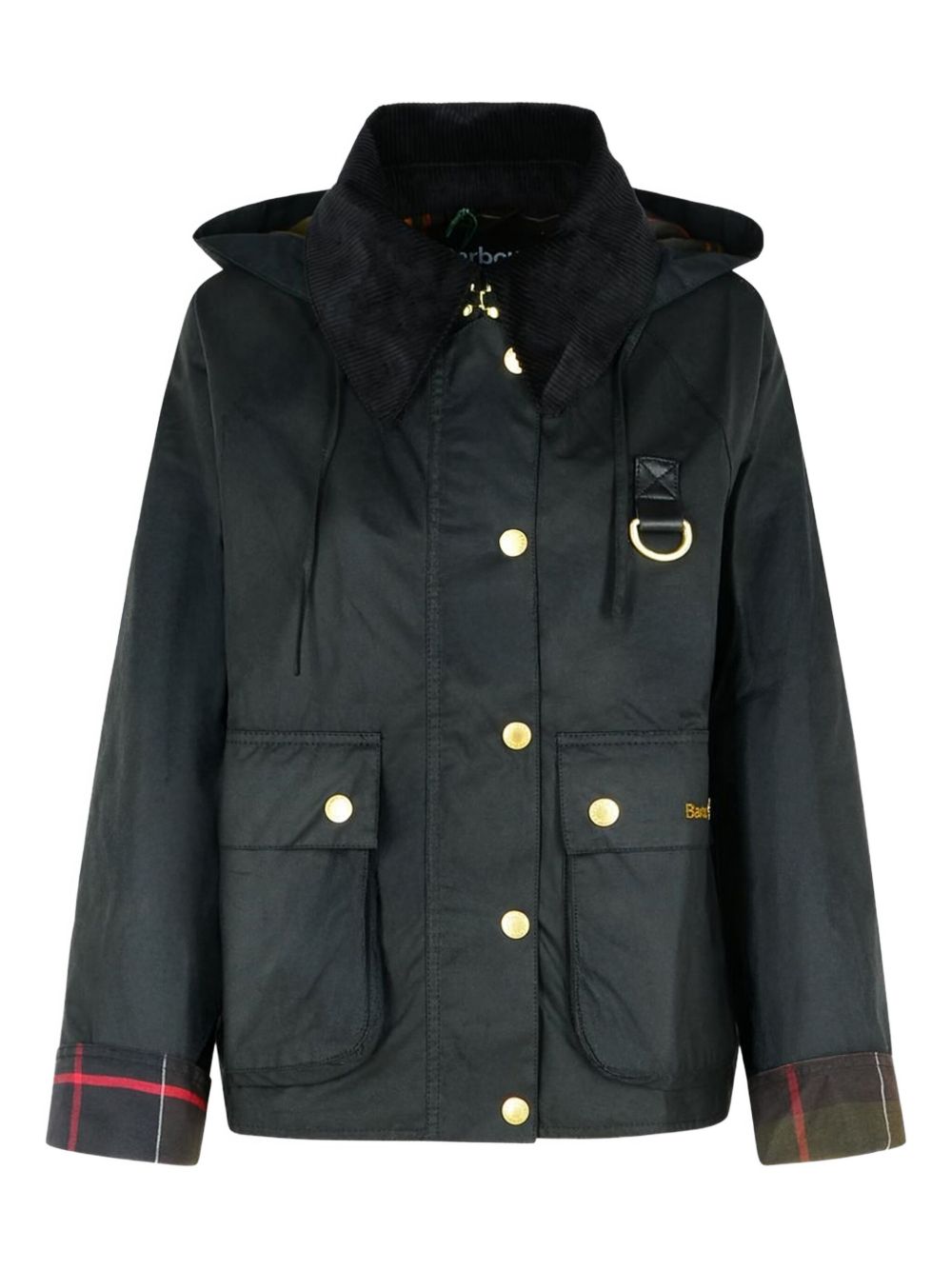 Giacca verde militare in velluto a coste di cotone cerato, collo con dettagli a quadri, polsini con anelli a D, chiusura con cerniera e bottone, due tasche laterali | Barbour