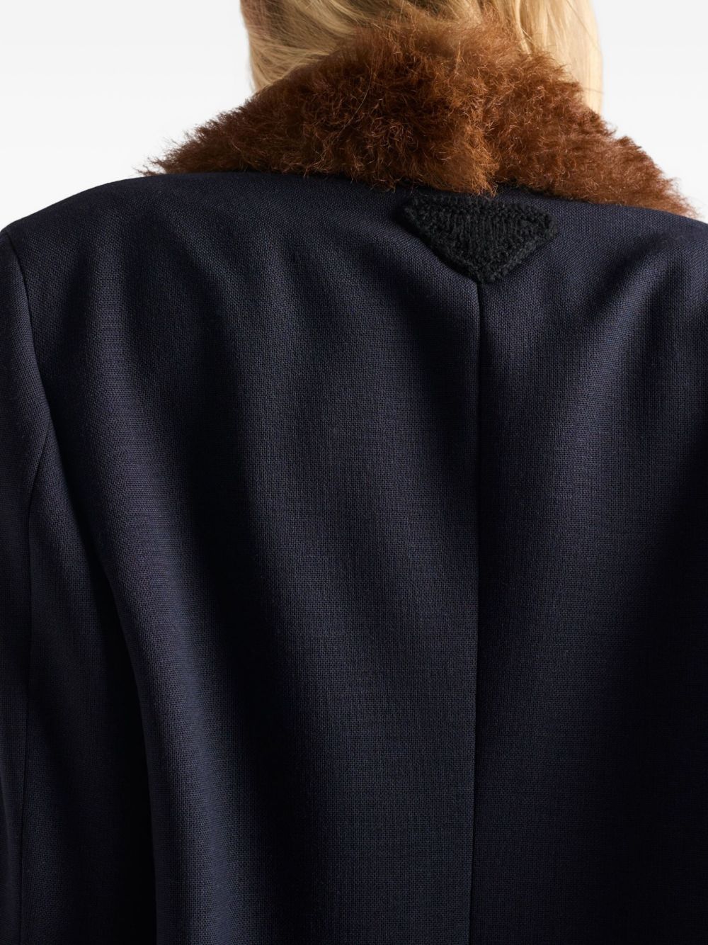 Giacca blu, revers a lancia, chiusura frontale con bottoni, tasche con patta, spacco posteriore, tessuto di lana | Prada