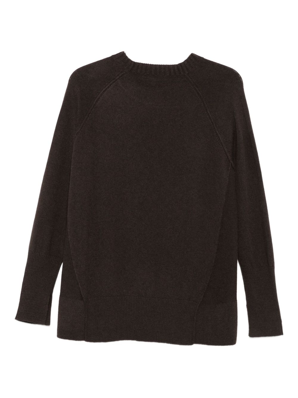 Girocollo marrone, maniche lunghe, spacchi laterali, polsini e fondo a costine.