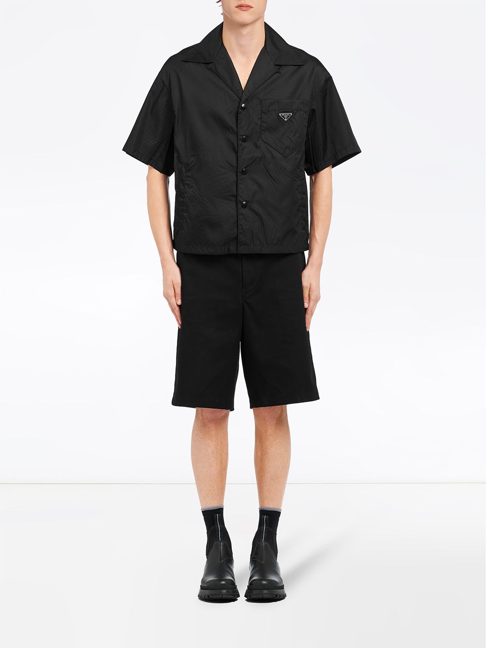 Elegante camicia con maniche corte in un sofisticato nero, caratterizzata da un design minimalista e dettagli ricercati. Presenta revers classici e una chiusura frontale con bottoni, arricchita da una tasca applicata sul petto e una distintiva placca con logo Prada. Realizzata in Italia con un'innovativa composizione di poliamide riciclata, questa camicia rappresenta un perfetto equilibrio tra sostenibilità e lusso, ideale per l'uomo contemporaneo che cerca un'eleganza senza tempo..