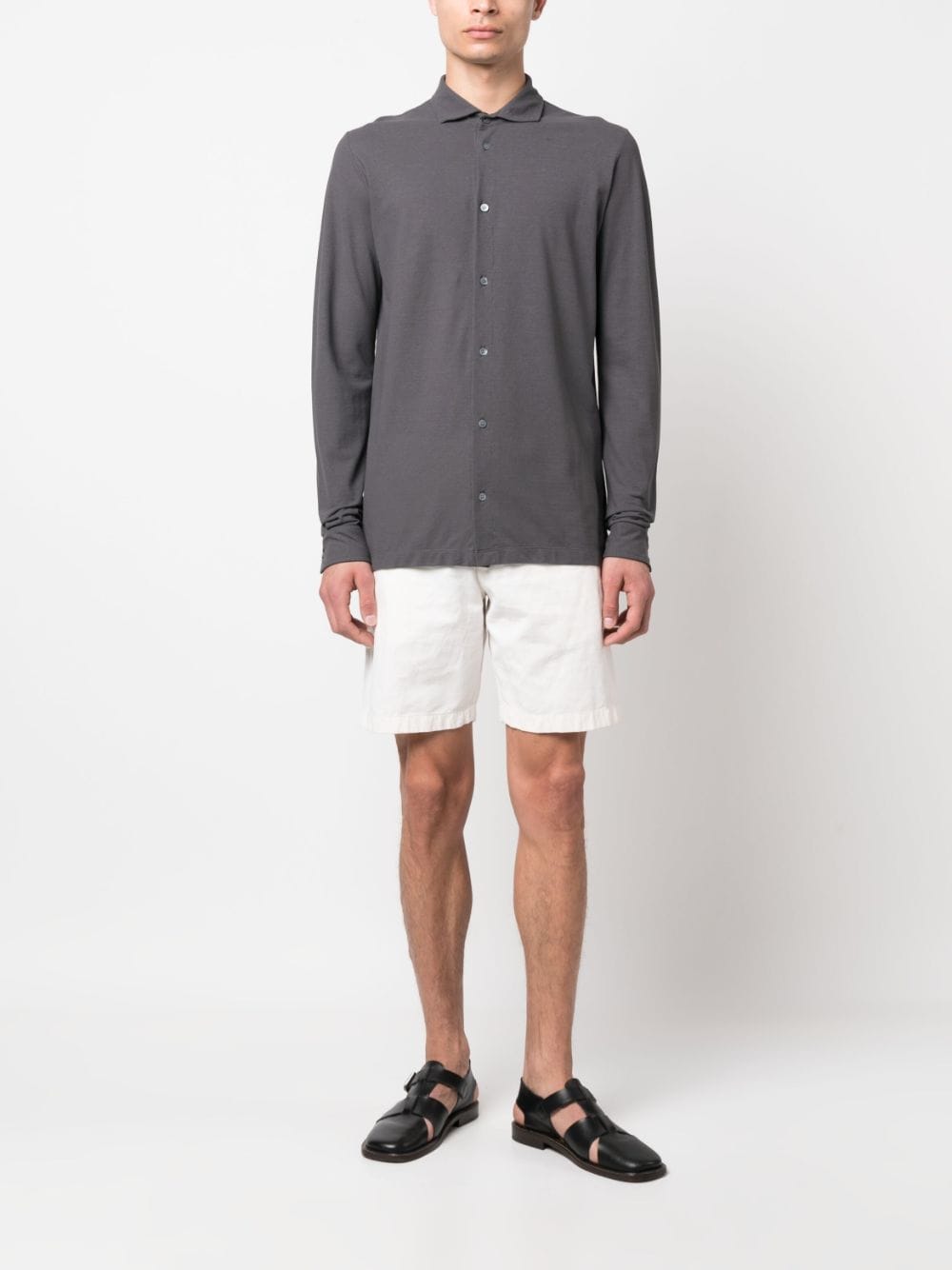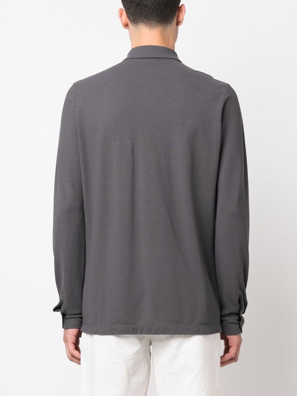 Grigio ardesia, cotone, lavorazione in jersey, collo alla francese, chiusura frontale con bottoni, maniche lunghe, orli con bottone e orlo dritto. | Zanone