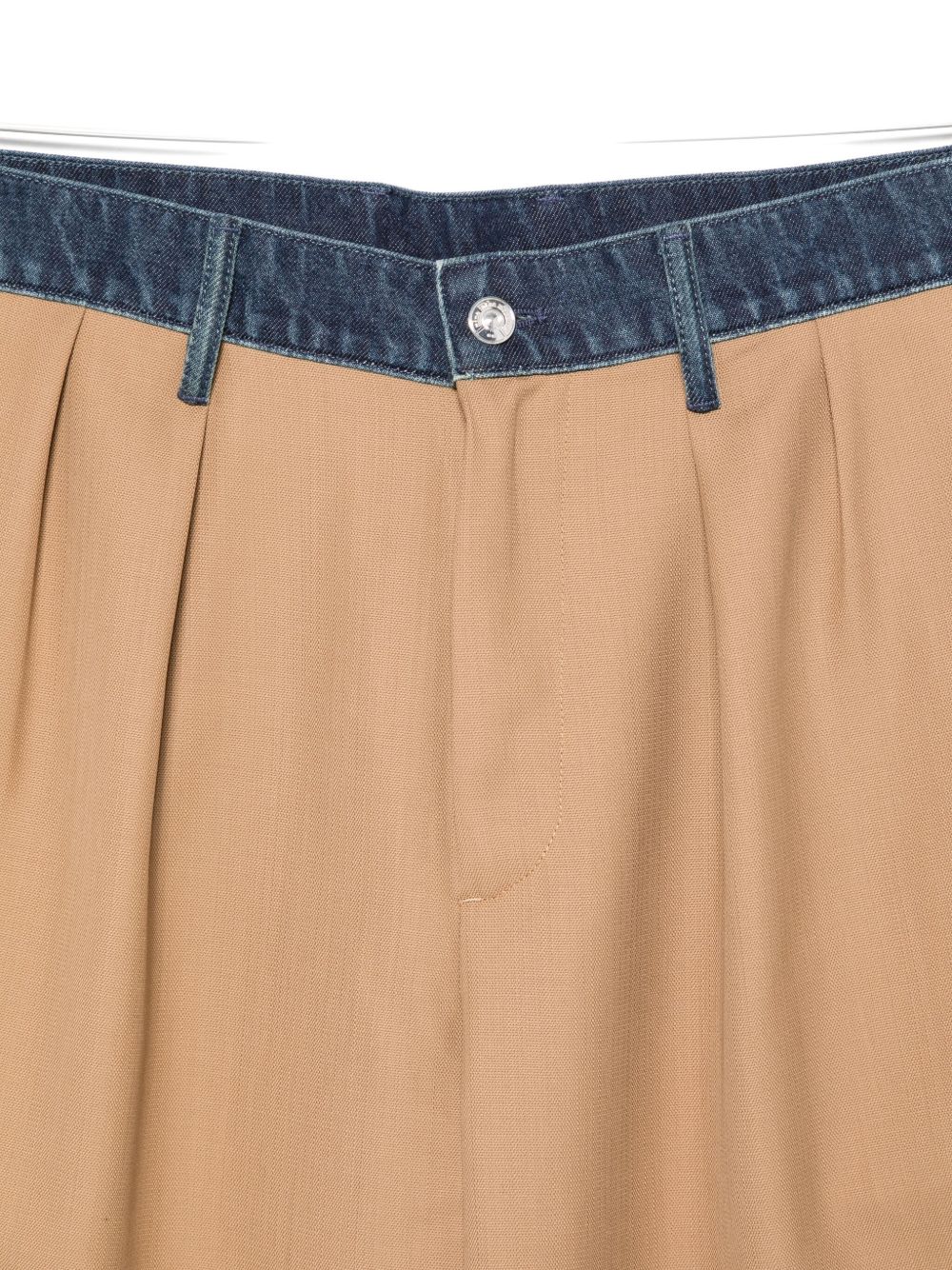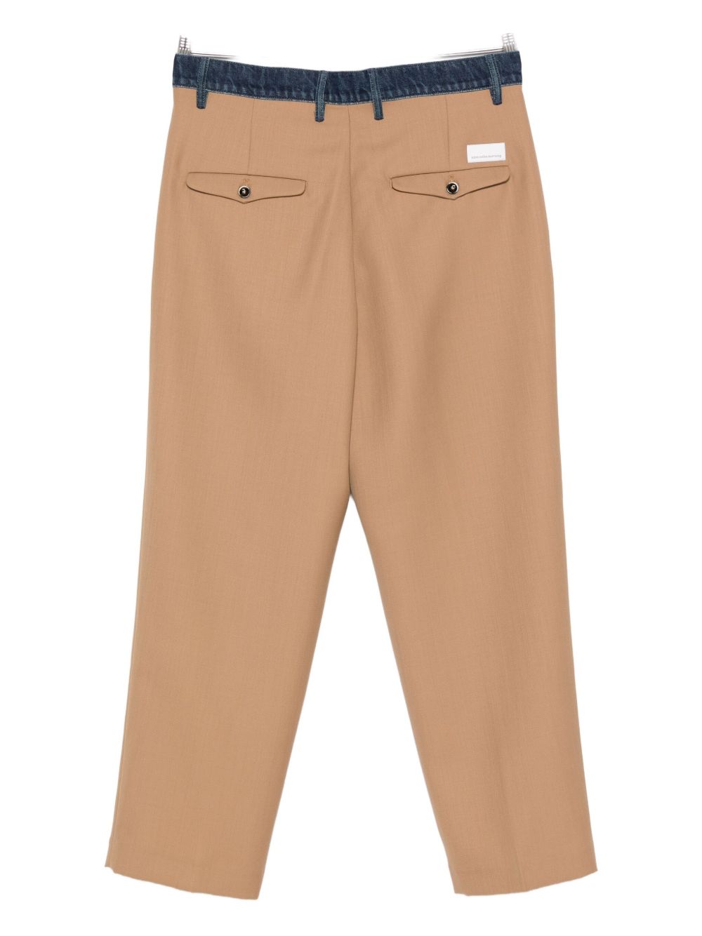 Pannello in denim marrone chiaro, chiusura con bottoni, passanti per cintura, dettaglio pieghe, tasche posteriori