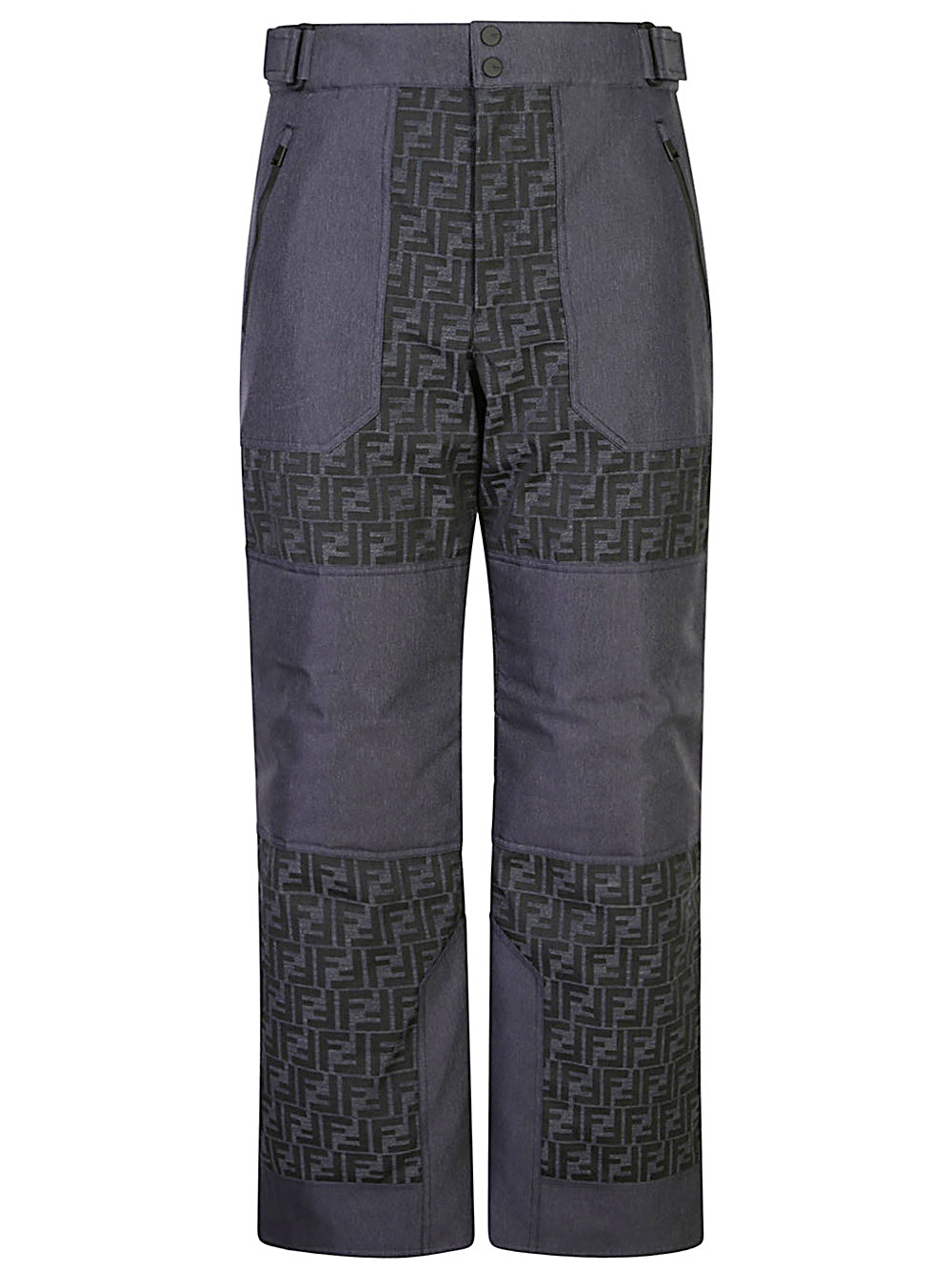 Pantaloni da sci a vita alta con cinturini laterali regolabili e tasche zip sui fianchi. Chiusura con zip coperta e bottoni a pressione. Realizzati in Jacquard FF e inserti tinta unita color blu jeans. Rifinito con dettagli rinforzati all'altezza delle ginocchia e sul fondo.