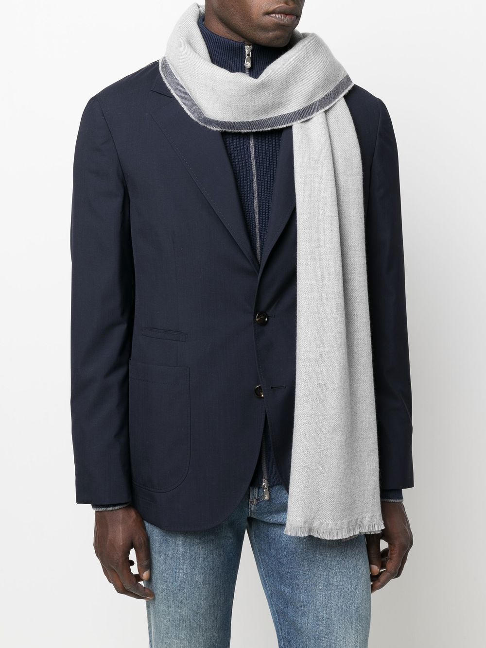 Sciarpa in misto lana e cashmere grigio chiaro/blu navy, lavorazione a maglia, bordi a contrasto e bordo sfrangiato | Brunello Cucinelli