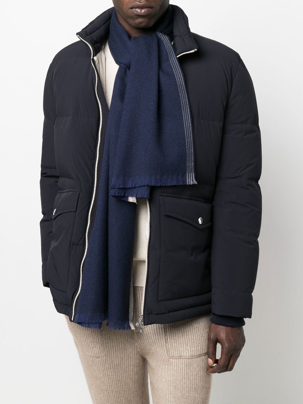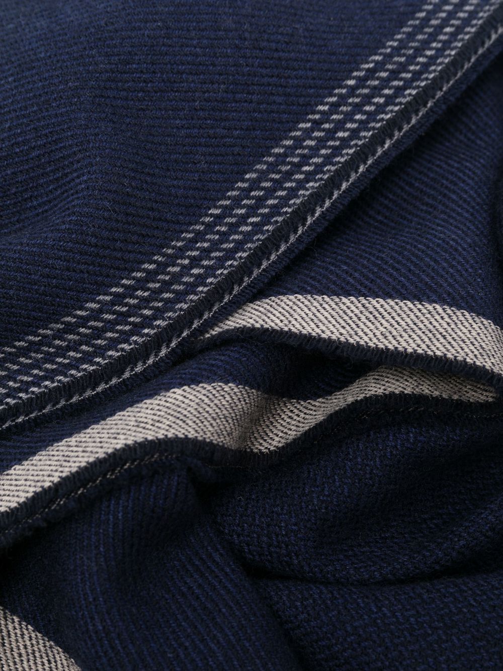 Sciarpa in misto lana e cashmere blu navy, lavorazione a maglia, bordi a contrasto e bordo sfrangiato | Brunello Cucinelli