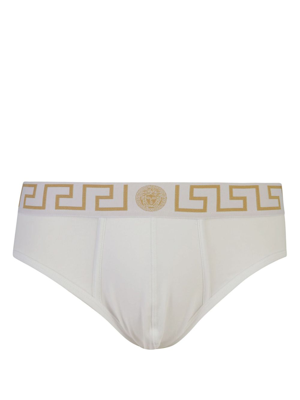 Versace, set 3 slip bianco con bordo greca logo colore oro
