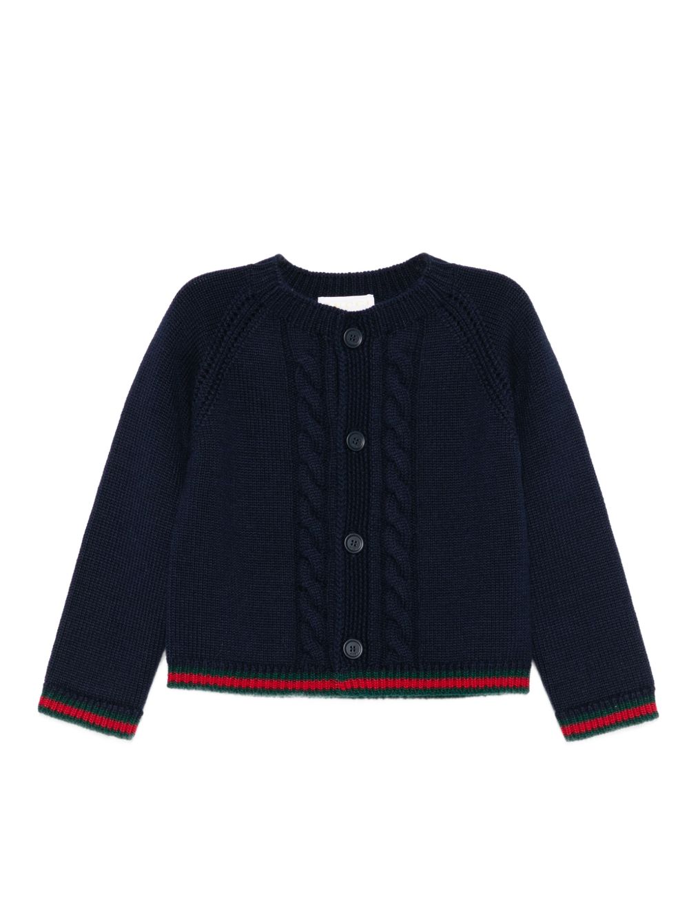 Giacca cardigan in maglia a trecce blu, chiusura con bottoni, finiture rosse e verdi, orlo a coste, maniche lunghe | Gucci Kids