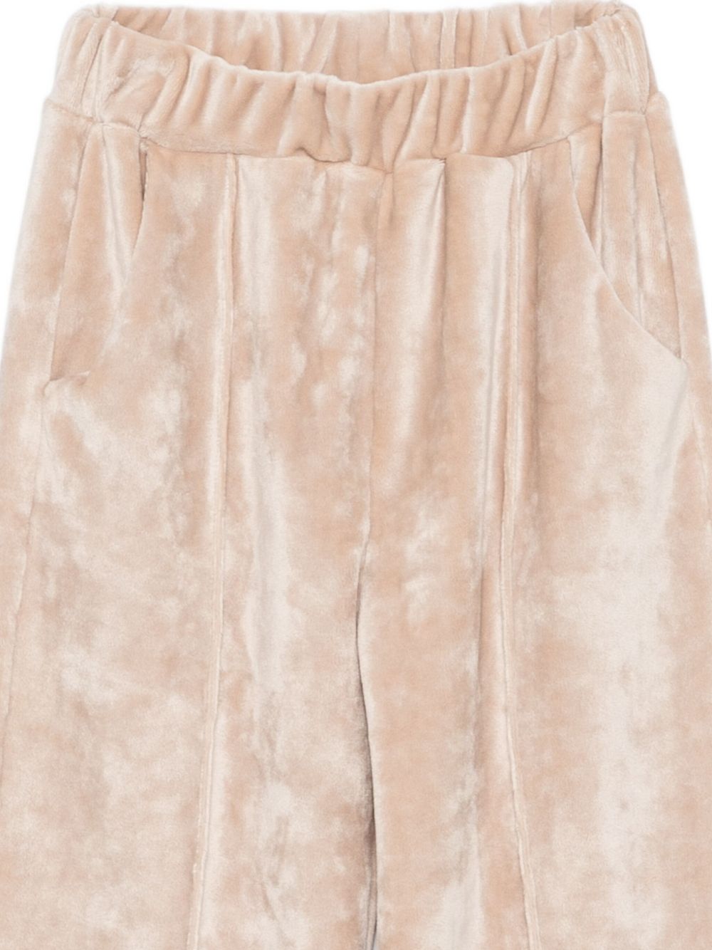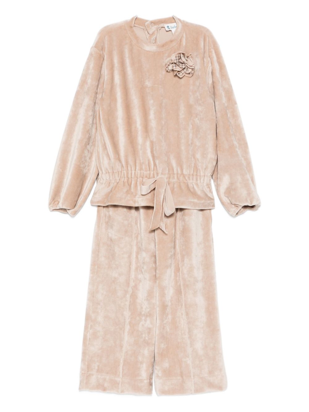 LALALU Tuta in velluto con polsini elasticizzati beige, cuciture in rilievo, applicazione floreale staccabile ed elastico in vita. Origine: Italia. Composizione: Poliestere 92%, elastam 8%..