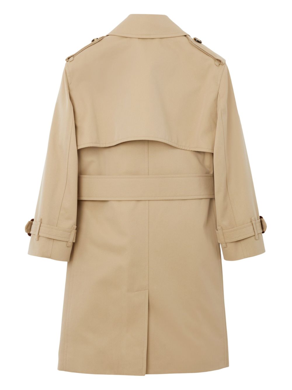 Miele, cotone, revers classici, abbottonatura sulla spalla, chiusura frontale con bottoni, maniche lunghe, spacco centrale posteriore, modello con cintura, due tasche laterali a filetto e orlo dritto. | Burberry Kids