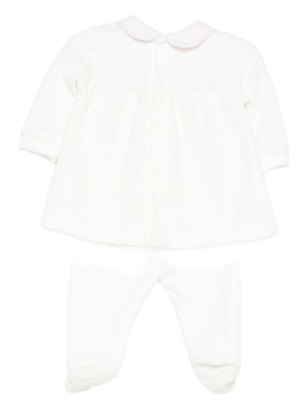 pantaloni bianchi con colletto arrotondato, maniche lunghe, piedini, dettaglio ricamato