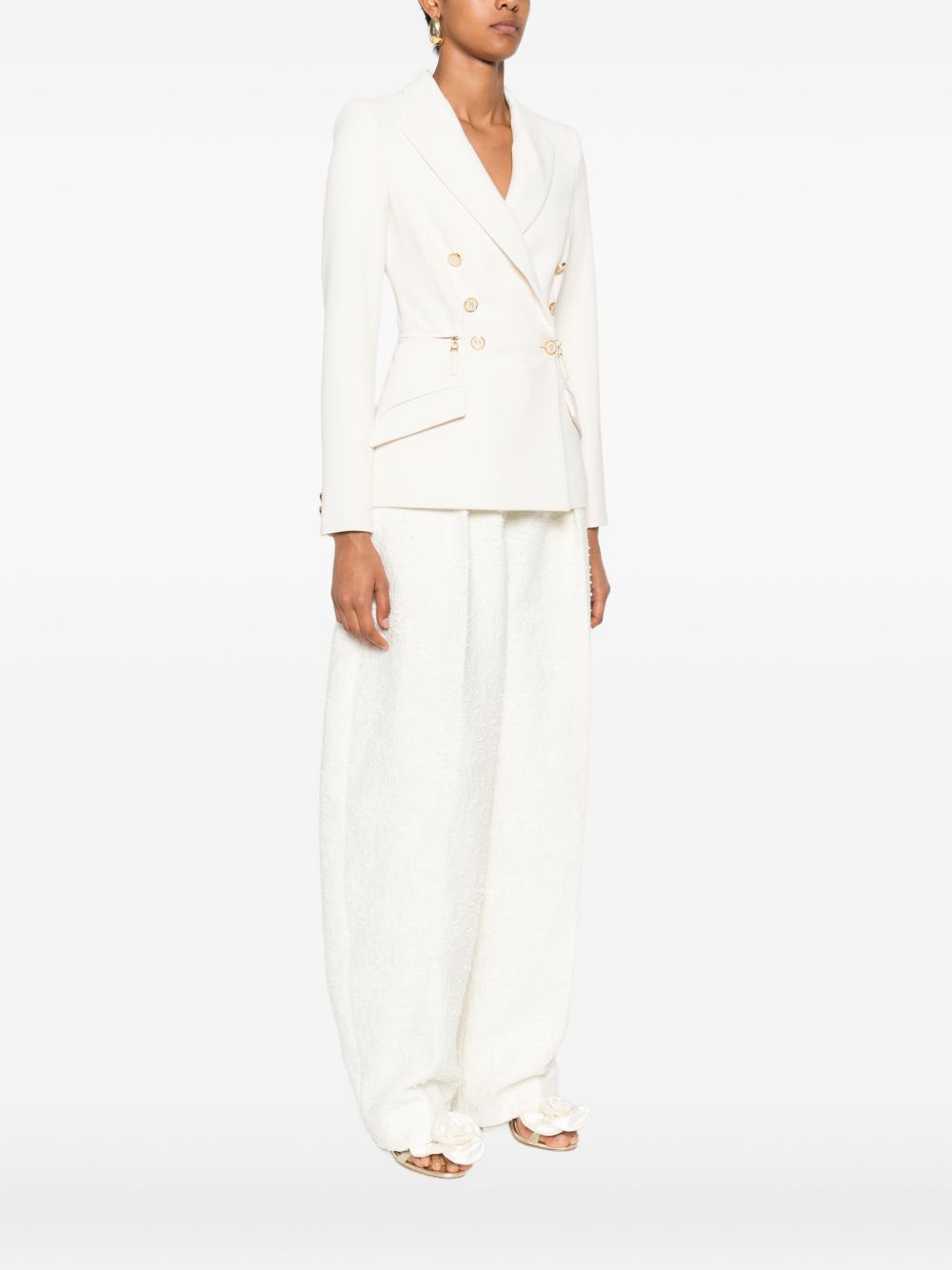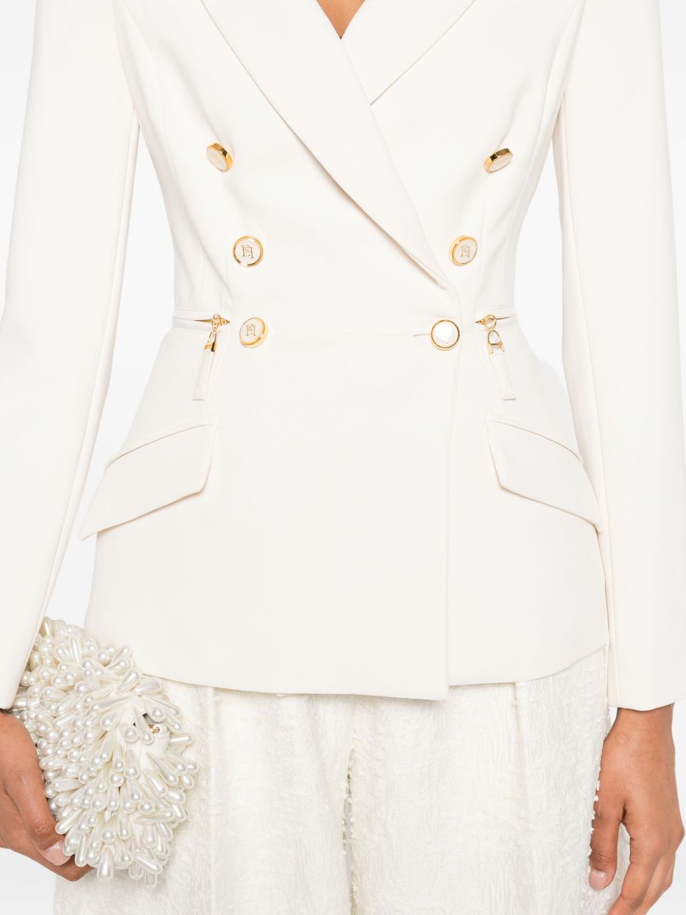 Giacca doppiopetto color bianco , bottoni dorati, chiusura con bottono, zip sulle tasche, affusolata sul punto vita | Elisabetta Franchi