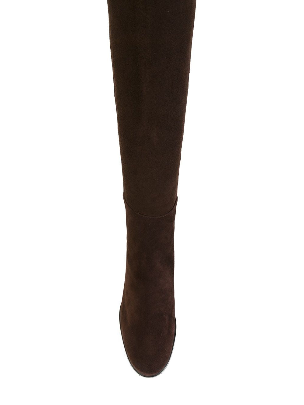Stivale in camoscio marrone sopra il ginocchio. Tacco a blocco. Punta arrotondata. Pull-on con retro elasticizzato. Costruzione con retro elasticizzato. Un’icona Stuart Weitzman. Parte della Collezione 5050. | Stuart Weitzman.