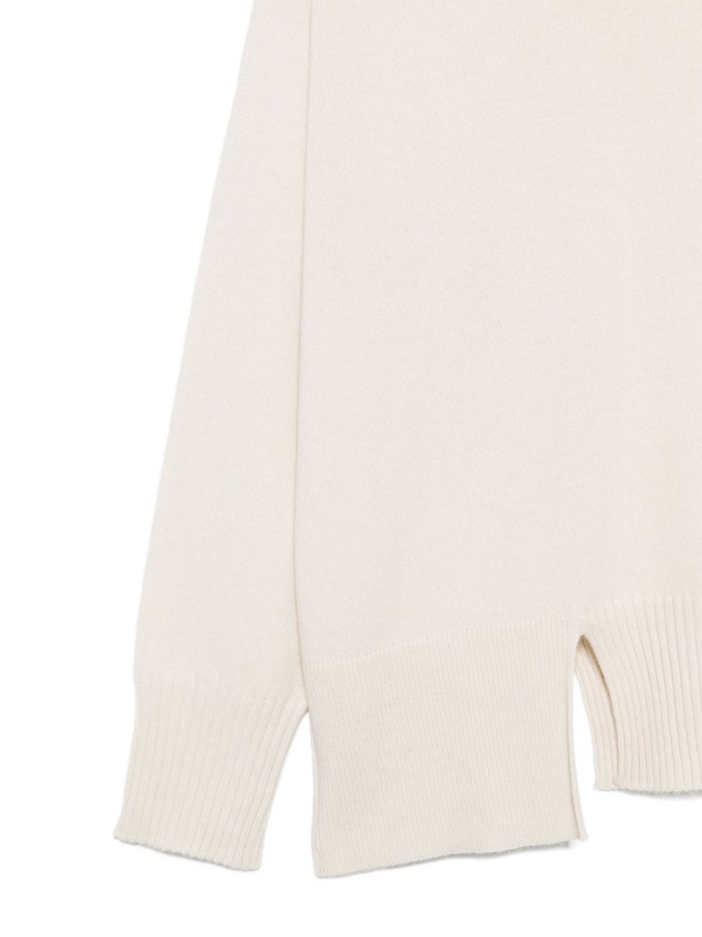 Colore écru, collo alto, spacchi laterali, maniche lunghe, polsini e orlo a coste.