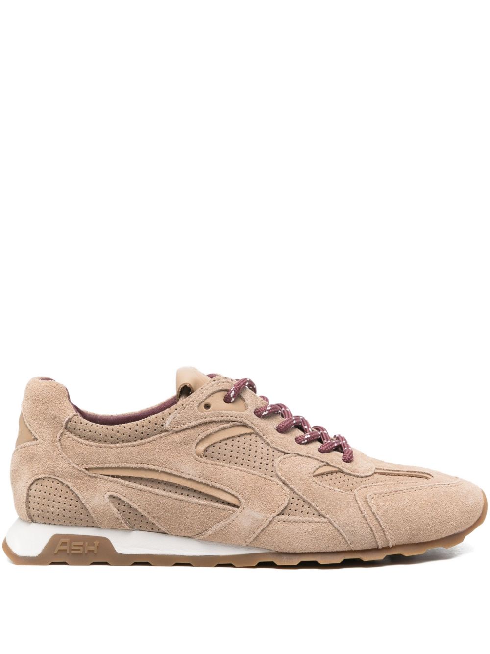 Le Ash Kasar lace-up sneakers sono realizzate in morbida pelle scamosciata beige, con una chiusura a lacci e suola in gomma. Il design presenta un dettaglio a motivo diamante sul retro, rendendole uniche e stilose..