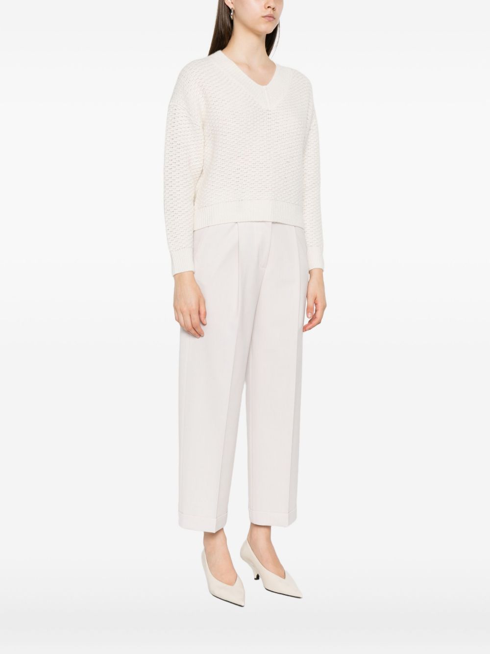 Salovan Store ha selezionato questo modello per il suo elevato contenuto stilistico e la sua ecosostenibilità. Peserico Maglione con scollo a V, bianco, con maniche lunghe e lavorazione in rilievo, lunghezza crop, realizzato in Italia..