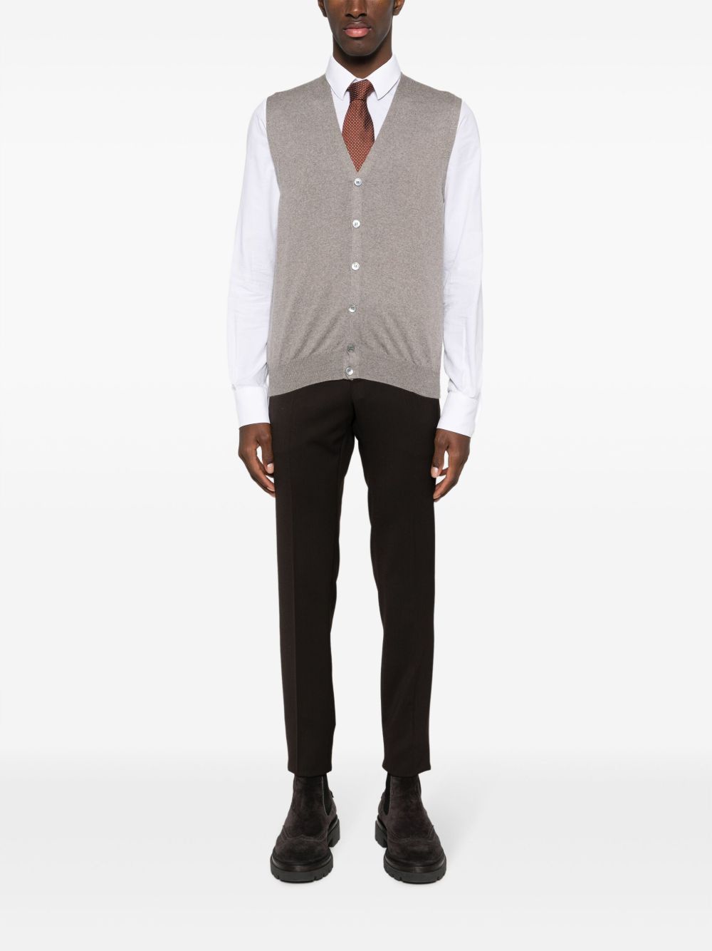 Grigio, lana vergine, maglia fine, scollo a V, chiusura frontale con bottoni, senza maniche, orlo dritto e orlo a coste. | Barba