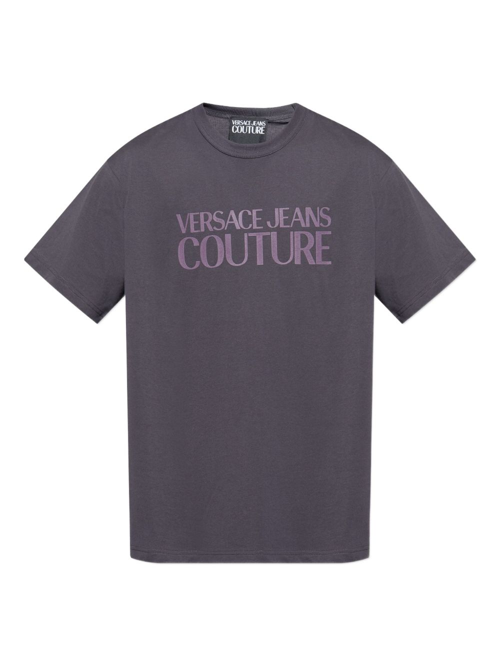 Versace Jeans Couture T-shirt con logo in grigio cotone, maniche corte e girocollo. Caratterizzata da una stampa con logo distintivo, è un must-have per la stagione Autunno Inverno 2025..