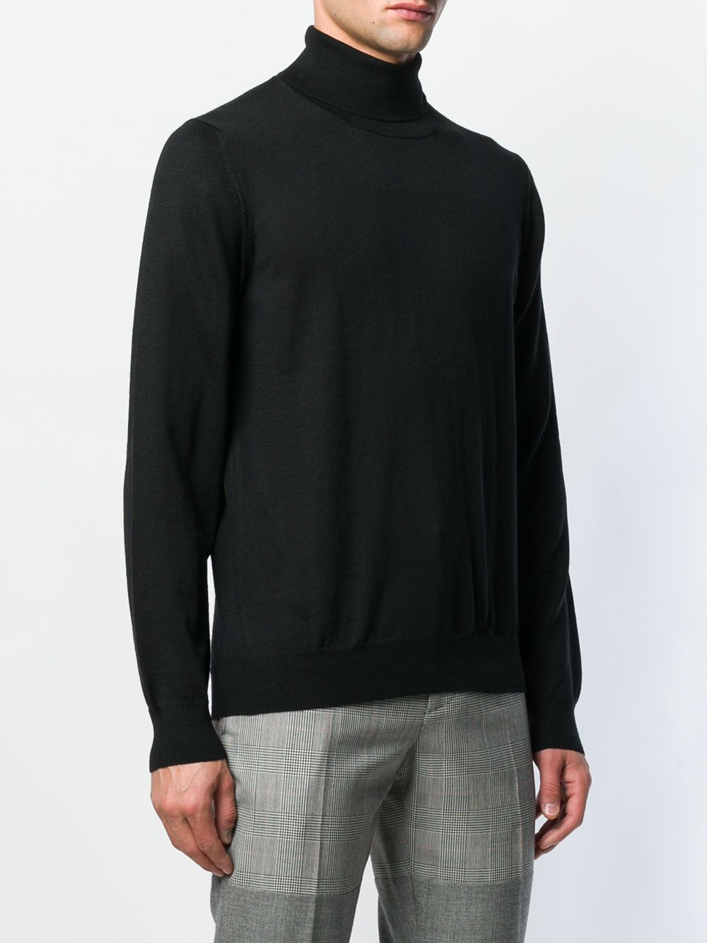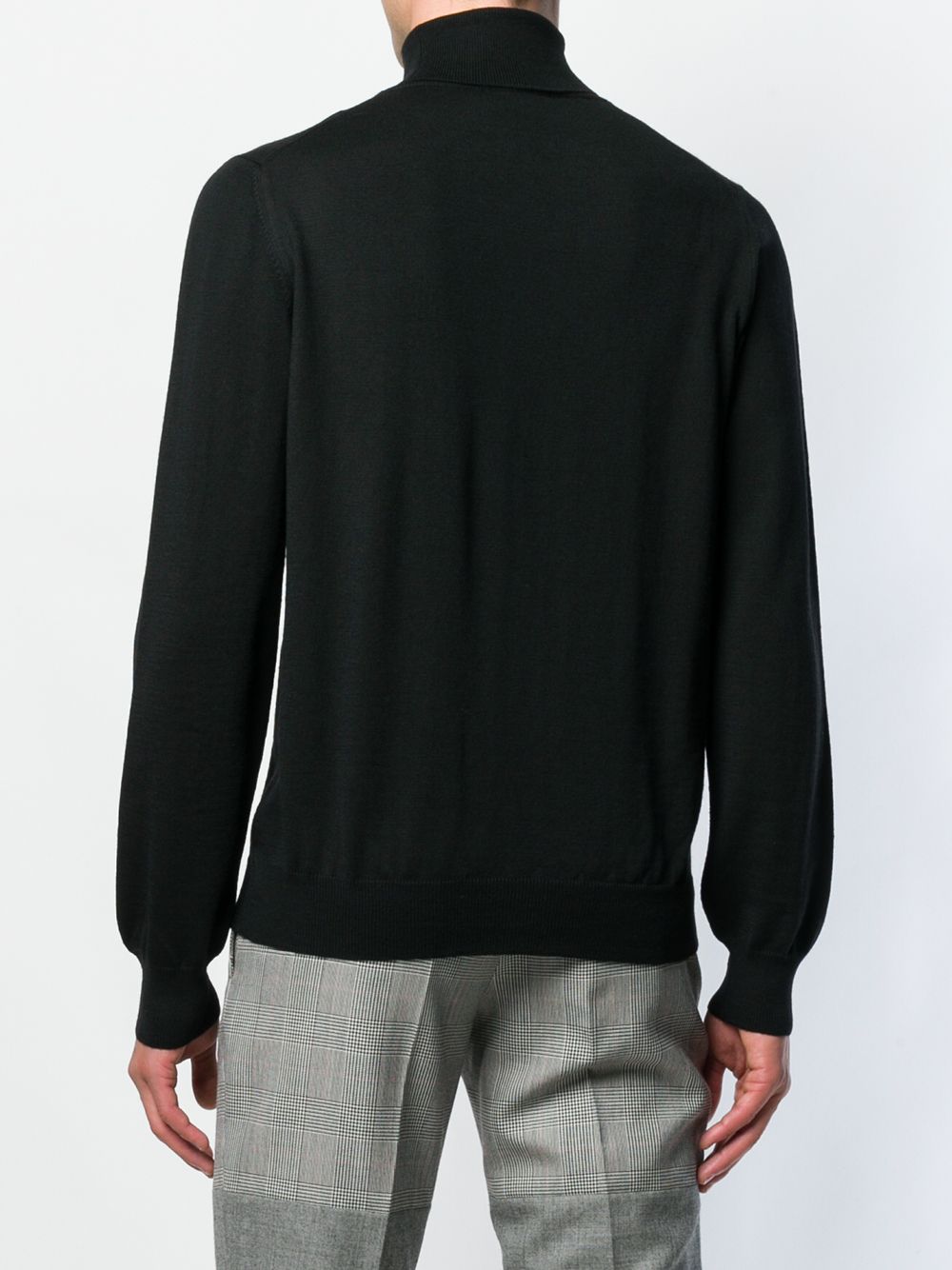 Maglione nero in lana vergine di Barba. Modello con collo alto a coste, manica lunga, orlo e polsini a coste e orlo dritto.