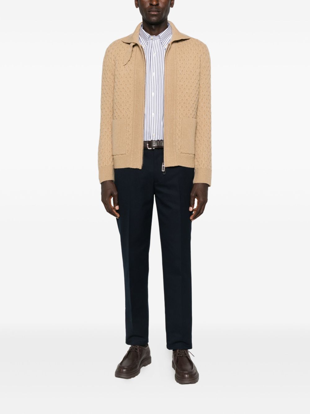 Giacca cardigan beige con motivo a nido d'ape, chiusura con zip a doppio cursore, scollo con colletto, tasche frontali applicate, maniche lunghe | Paolo Pecora