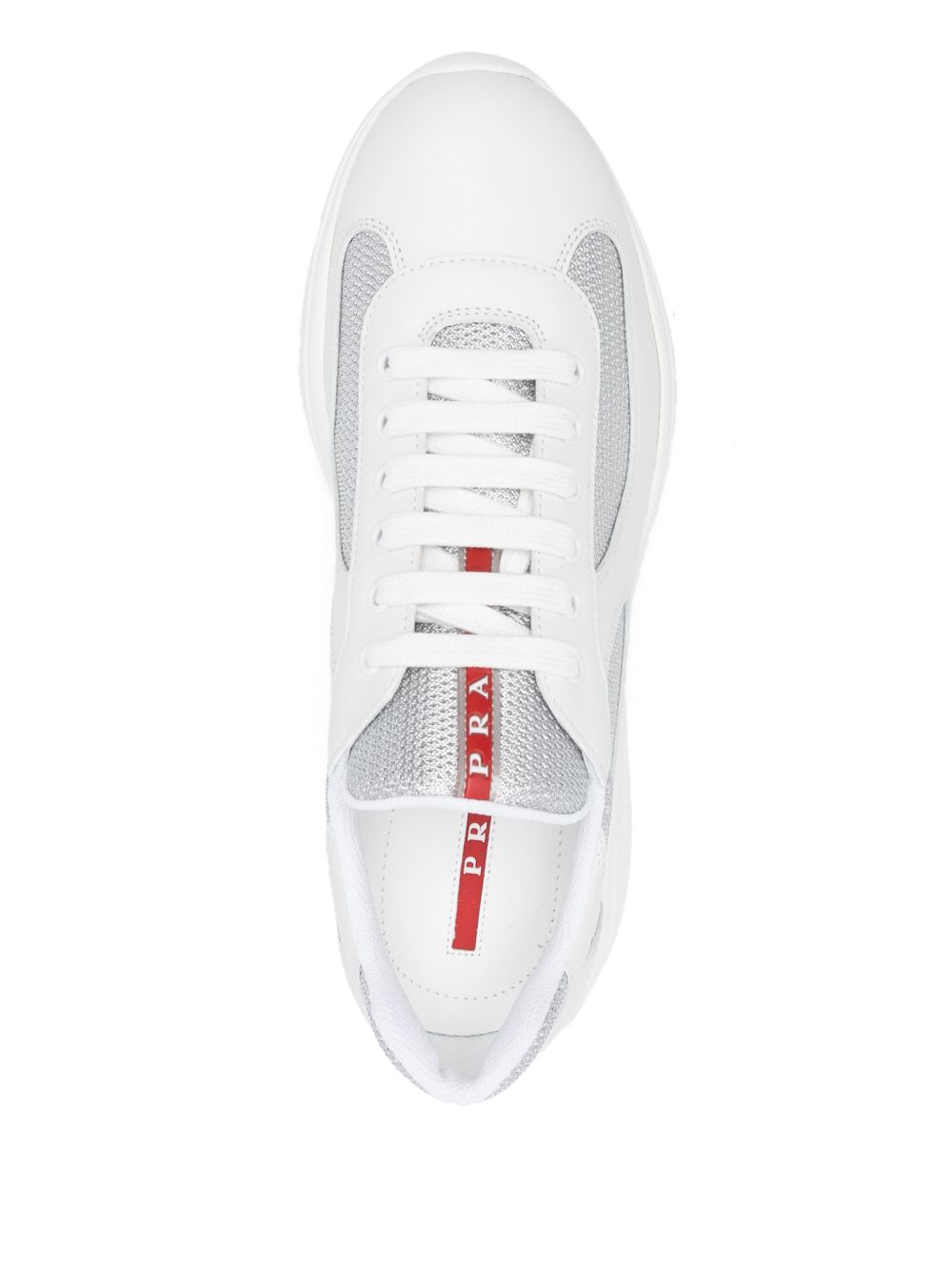 Le Sneakers America's Cup di Prada rappresentano un incontro sublime tra innovazione e tradizione. Caratterizzate da una silhouette pulita e raffinata, si presentano in un'elegante tonalità bianca. La chiusura frontale con lacci assicura una vestibilità impeccabile, mentre la punta tonda conferisce un tocco di classicità. La suola in gomma, robusta e versatile, è impreziosita da un'applicazione sulla linguetta con il logo distintivo di Prada. Realizzate in Italia con materiali di altissima qualità, come pelle di vitello e tessuto pregiato, queste sneakers sono un must-have per chi desidera un'eleganza senza tempo..